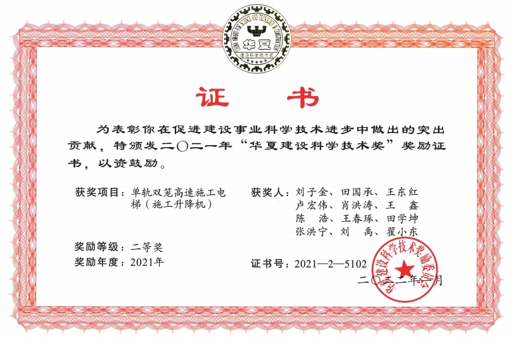 ? ? ? ? ? 本產品獲2項發明專利——施工升降機組合式驅動系統(專利編號:ZL201710316114.0)和手動離合增力矩裝置(專利編號:ZL201610933946.2);主編參編GB/T37537-2019《施工升降機安全監控系統》、GB/T 26557《吊籠有垂直導向的人貨兩用施工升降機》兩項國家標準;2021年榮獲“華夏建設科學技術獎”二等獎。為解決我國超高層建筑人員物料垂直運輸的高效安全平穩運行難題提供了強有力的技術支撐。