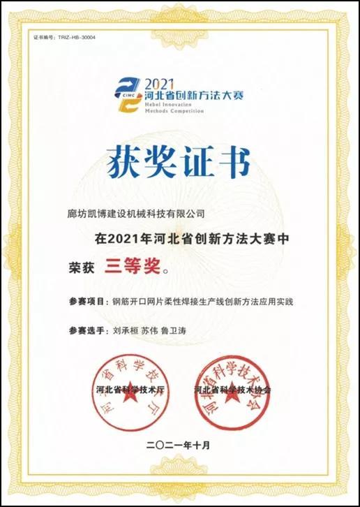 廊坊凱博建設機械科技有限公司(以下簡稱“凱博科技”)完成的“鋼筋開口網片柔性焊接生產線創新方法應用實踐”項目在2021年河北省創新方法大賽中榮獲三等獎。此次參賽是凱博科技創新團隊第二次參加河北省創新方法大賽,2019年凱博科技“教學型塔式起重機”項目曾獲“2019河北省創新方法大賽三等獎”。